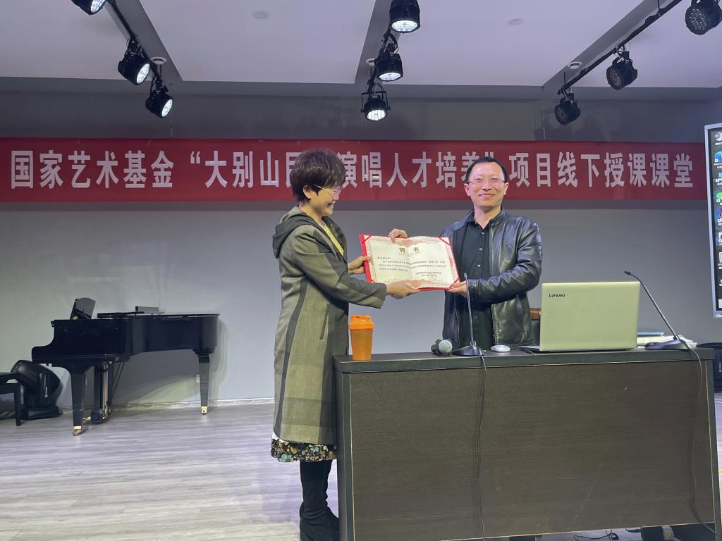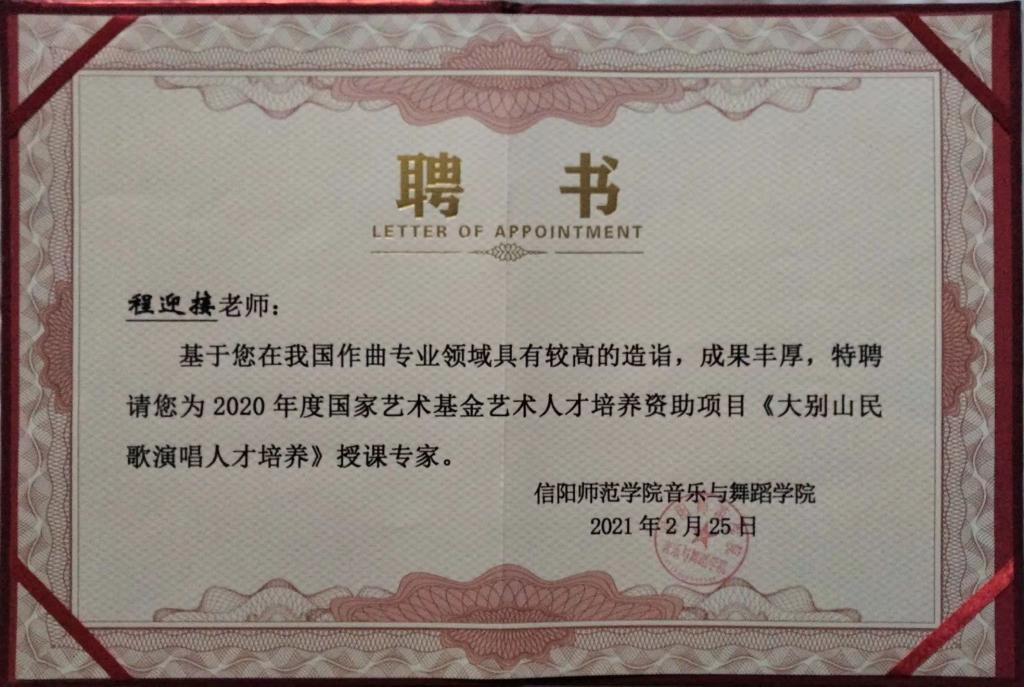 2022年3月9日,2020年度国家艺术基金艺术人才培养项目“大别山民歌演唱人才培养”开班仪式在信阳师范学院艺术楼报告厅举行。该项目聘请了王原平、李幼平、王和泉、戴滨、余惠承等一批全国著名作曲家、音乐学家、歌唱家和大别山民歌非物质文化遗产传承人进行授课,受训对象为来自全国部分高校的15名优秀演唱人才,旨在弘扬、传播大别山民歌文化。我校太阳集团tyc138程迎接副教授受聘担任该项目授课专家。