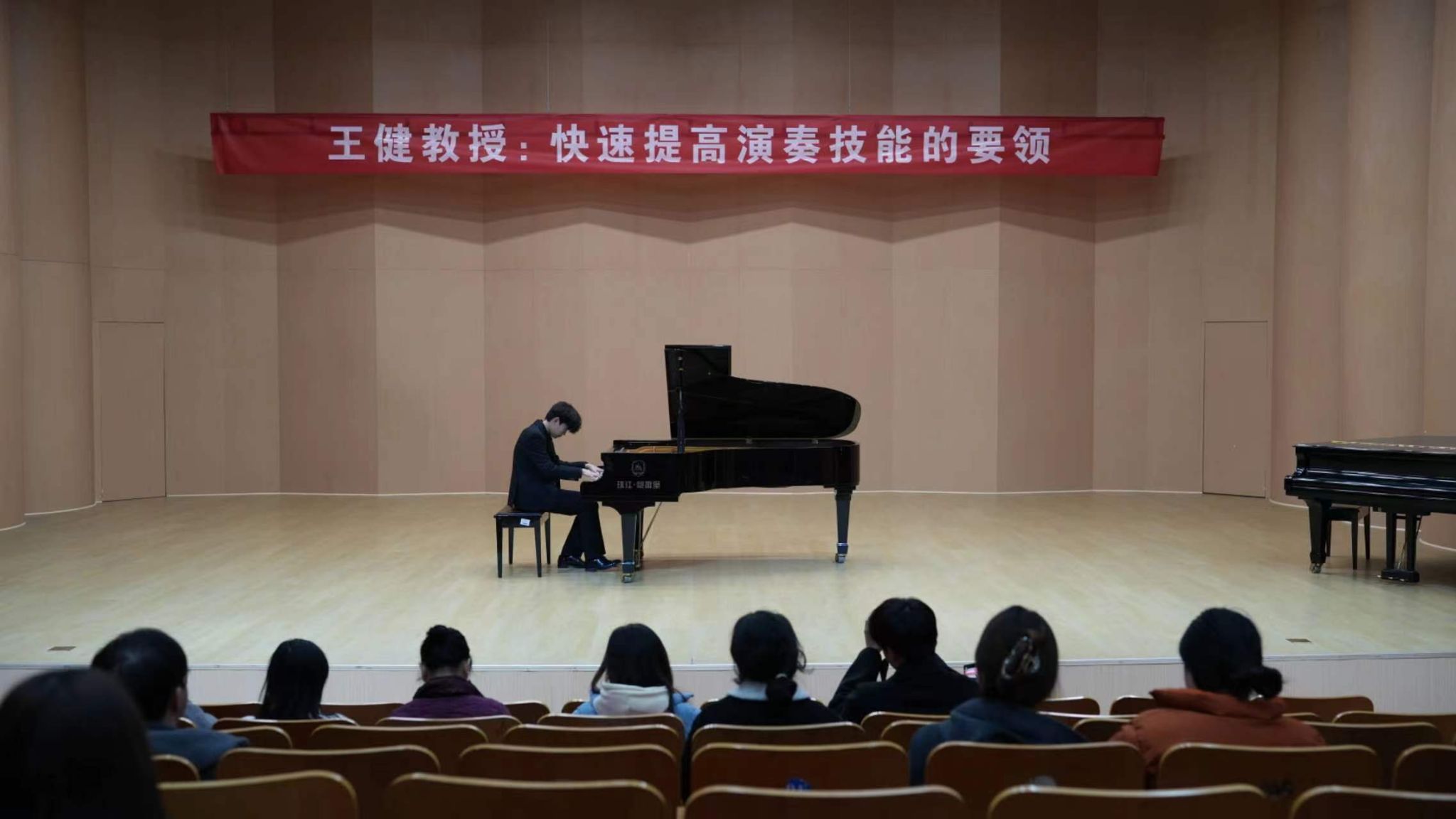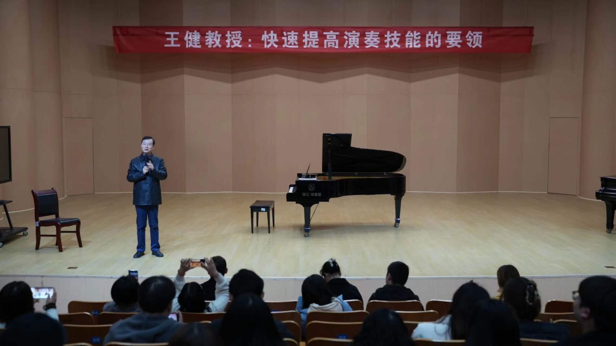 课上,王健教授以4位同学的演奏作品为例,生动地阐述了演奏钢琴作品不仅是完成技巧,还要从作品的文化背景、作曲家所处的时代、音乐的流派风格、层次线条等方面来处理,用理性的思路来分析作品。