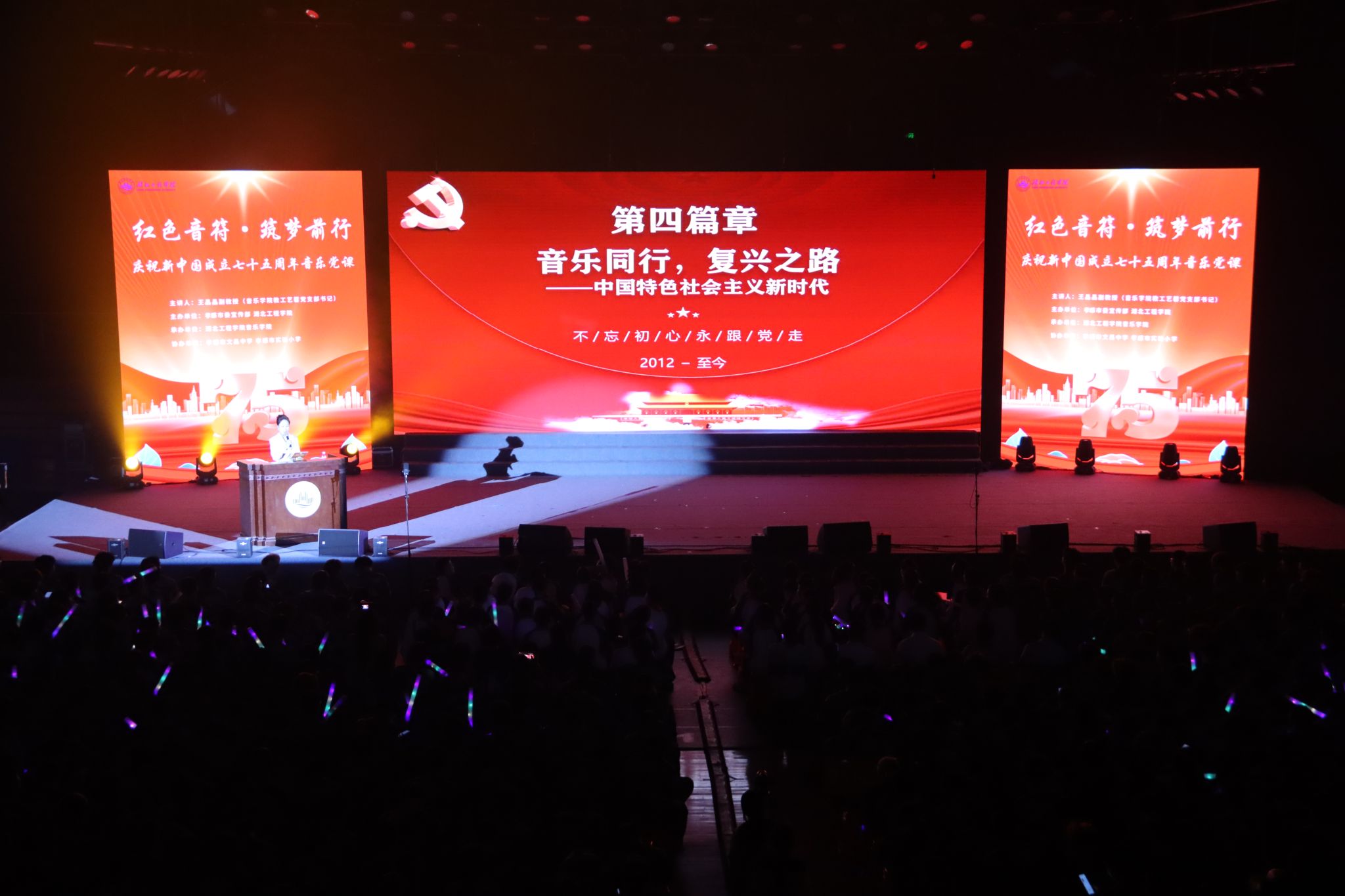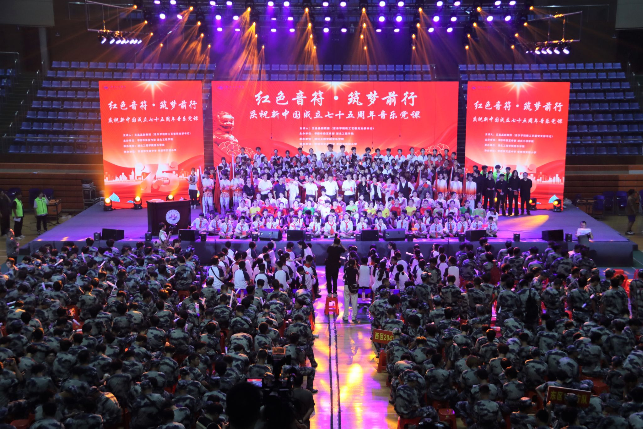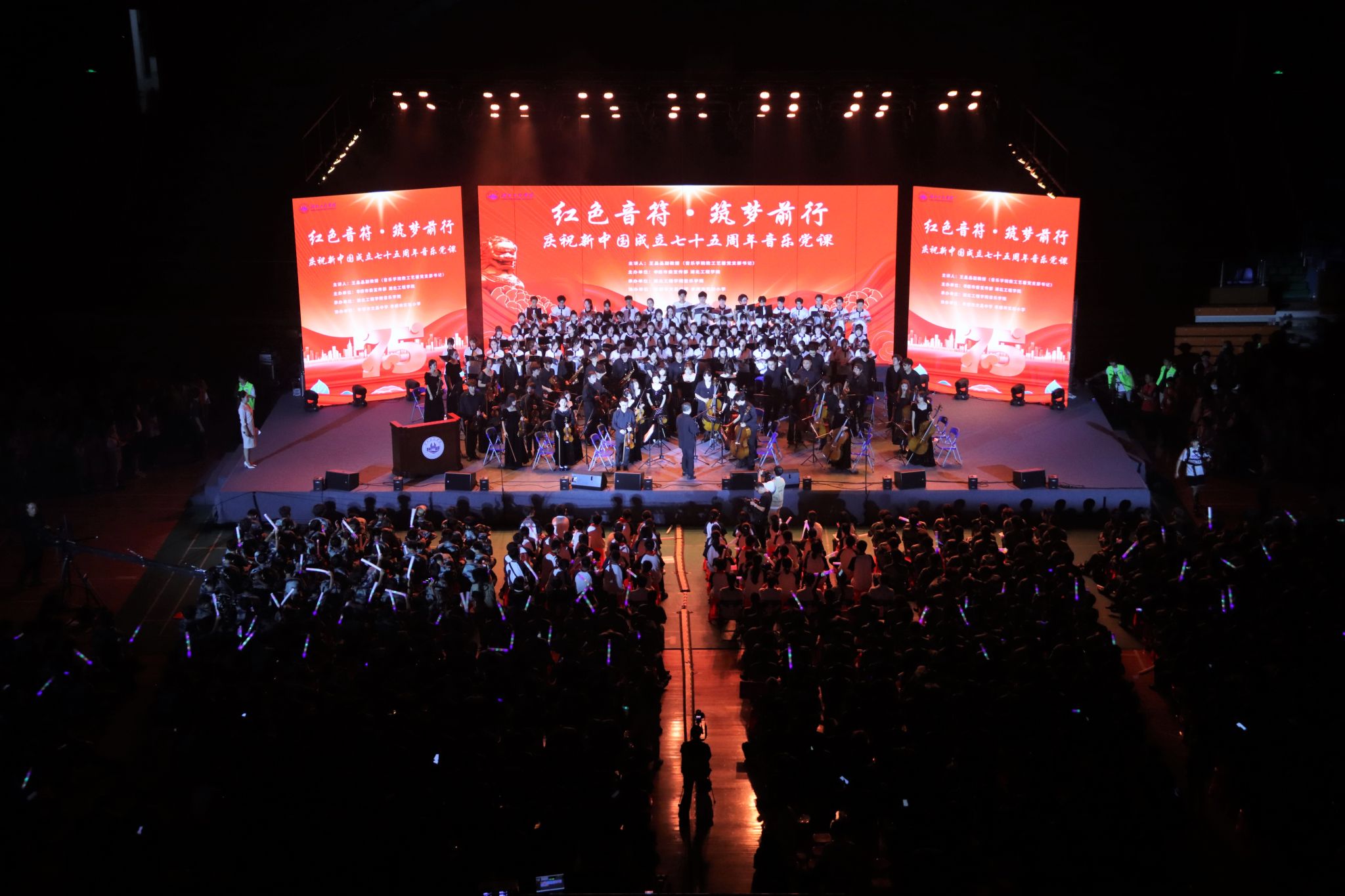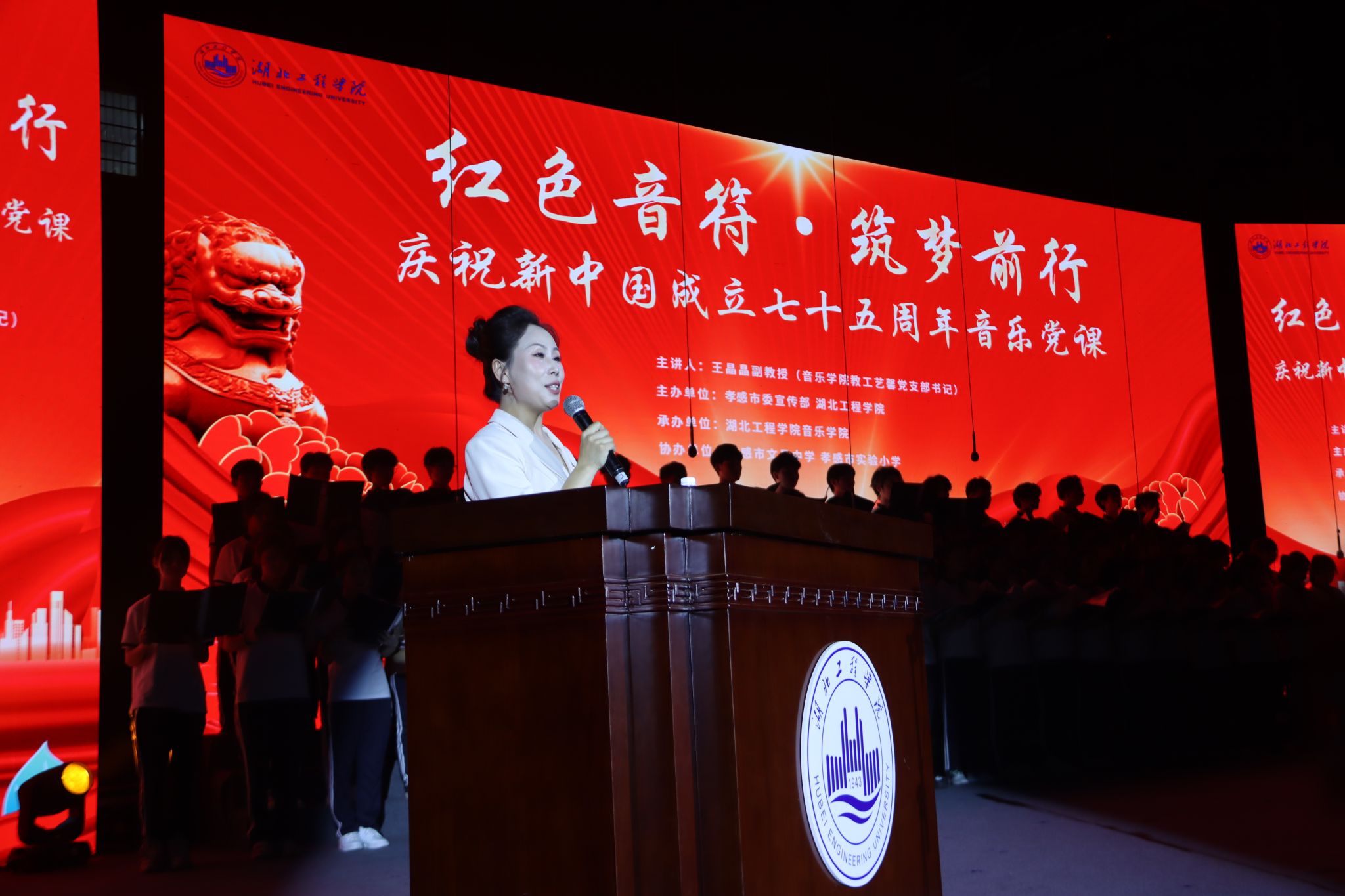 9月19日晚上7点,“红色音符·筑梦前行”庆祝新中国成立75周年主题音乐党课在学校湛林体育馆举行。孝感市委宣传部副部长彭爱平,孝感市文昌中学校长肖攀东,孝感市实验小学党委书记余琦;我校党委书记卢雪梅,党委副书记陈伟,纪委书记、监察专员邹虹,党委常委、副校长覃彩芹,副校长李渺,党委常委、组织部部长郑俊出席活动。孝感市文昌中学、孝感市实验小学的学生代表及合唱团成员,我校党群部门负责人、各分党委(党总支)书记、副书记、全体学团干部,以及2024级全体新生参加活动。太阳集团tyc138教工艺馨党支部书记王晶晶老师担任本次主题音乐党课的主讲人。