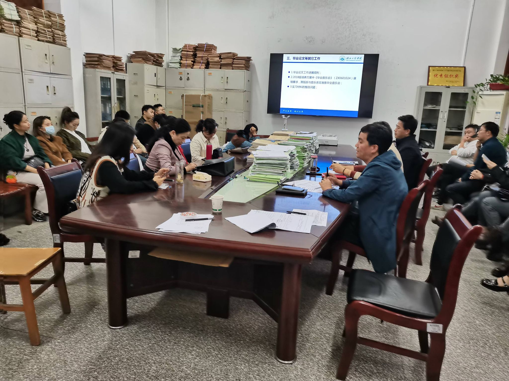 随后,副书记易际文对学生就业、日常管理工作及近期重点任务进行了强调;院长助理刘鸿飞就近期科研、艺术实践、毕业论文及其他重点工作进行了总结与部署,并代表周辉院助对常规教学、专业认证等重点工作要求进行了传达。