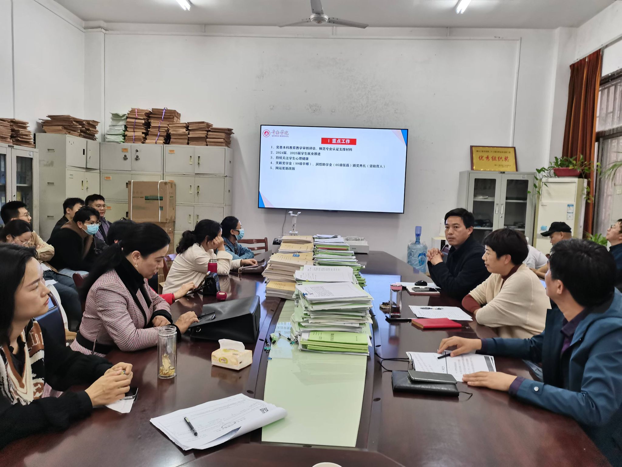 最后,姜涛书记代表鲁勇院长就教育教学审核评估、师范专业认证、年度目标考核以及财务管理工作等重点工作提出要求。她强调,全体教职工要认真学习贯彻党的二十届三中全会及全国教育大会等会议精神,紧紧围绕学校党委提出的“三抓三强三提升”工作思路,携手并进、守正创新,以改革创新的精神推进审核评估等重点工作落地落实,推动学院各项事业迈上新台阶。