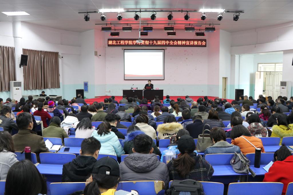 12月9-17日,我校举行学习贯彻十九届四中全会精神宣讲报告会。校领导彭瑜、潘慧明、汪达和政治与法律学院、马克思主义学院的专家李新安、乐波、熊燕华等六名宣传团成员深入各单位进行宣讲。机关党总支各支部、后勤保障办公室、图书馆、离退休工作处副科级以上干部及党支部书记,各教学学院全体教职工、学生代表、在校学生党员等近两千多名师生在不同分会场聆听宣讲。